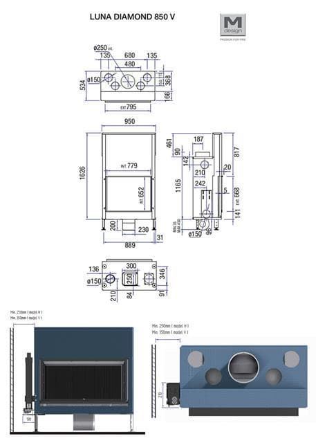Chimenea de leña Luna Diamond 800 DC (frontal y dos laterales)