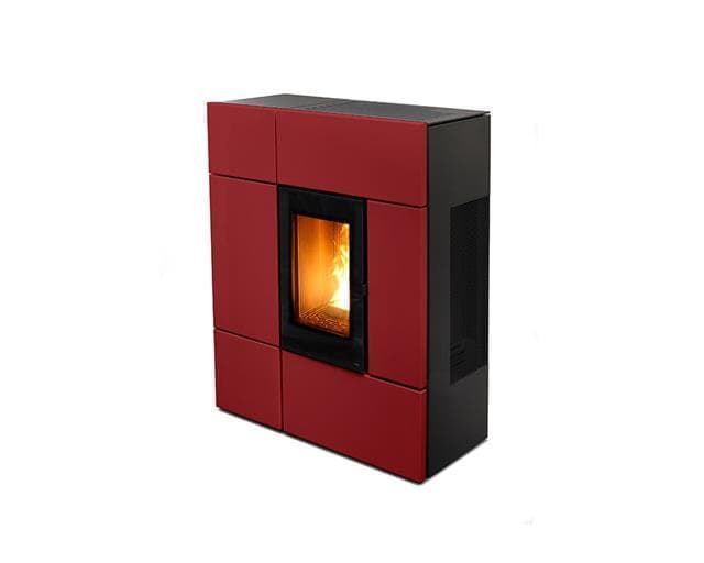 Estufa de pellet sin bocas frontales, realizada con estructura de acero pintado, puerta de cristal y revestimiento frontal en serpentín o acero pintado color White, Bordeaux, Dark. Brasero de fundición. Gestión inteligente de la combustión mediante Maestro. Salida de humos en la parte posterior o bien superior (versión UP!).