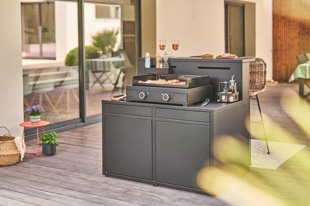 Fabricados en acero negro , nuestros muebles de cocina de exterior se benefician de un revestimiento de 3 capas que les confiere una mayor resistencia a los golpes, a los rayos UV y a la corrosión.